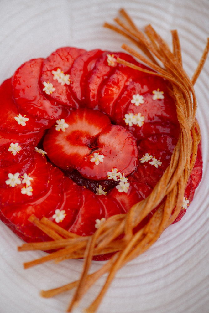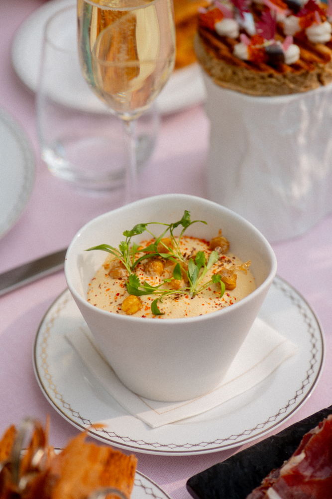 Además, una estación de parrilla abierta prepara al instante platillos como brochetas de salmón marinado con miso y shiso, onglet de res con mantequilla ahumada y cordero cocido lentamente al estilo provenzal. Los postres, creados por la reconocida chef pastelera Anne Coruble, incluyen flan de vainilla, panna cotta de ruibarbo y carpaccio de fresa con crema y sacristain caramelizado.