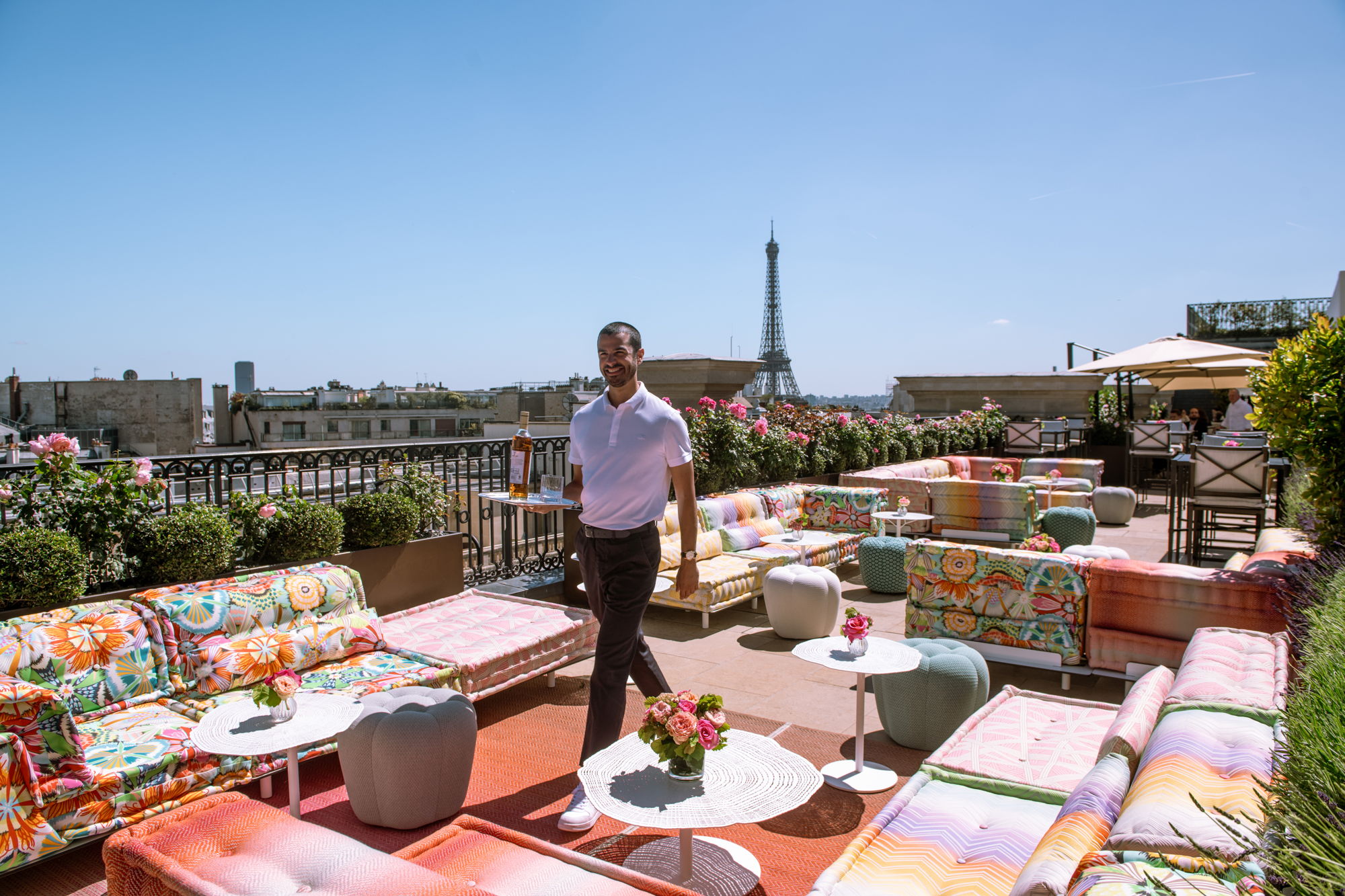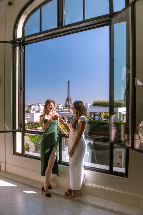 Como un jardín secreto suspendido entre el cielo y la ciudad, The Rooftop de The Peninsula Paris ofrece una de las vistas más espectaculares del verano. Rodeado de rosales en flor y sillones Roche Bobois, este espacio íntimo es el escenario perfecto para contemplar el atardecer sobre la Torre Eiffel y Sacré-Cœur.
