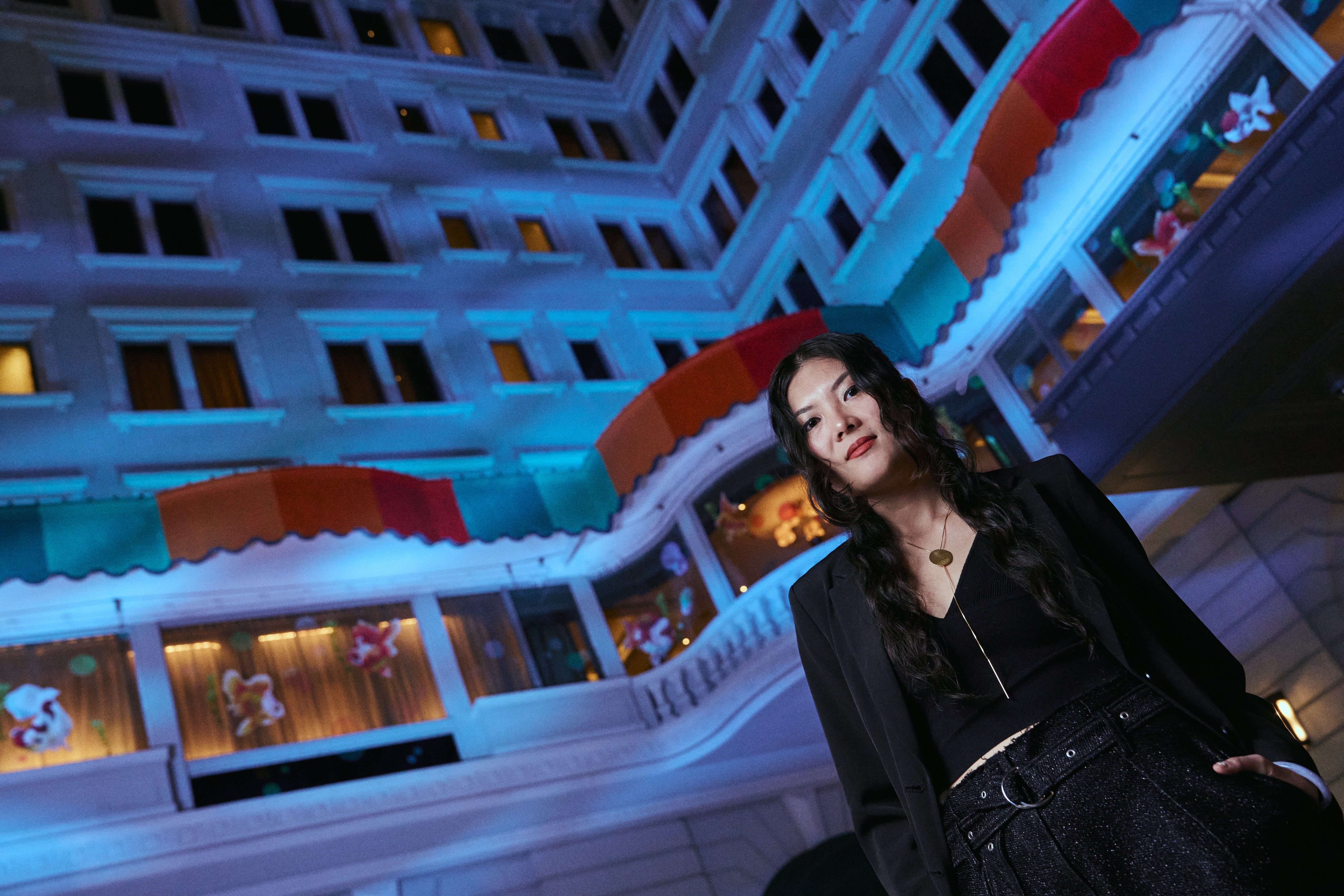 Los visitantes son recibidos por una instalación luminosa en la fachada de The Peninsula Hong Kong: Swimming in Light, de la artista Angel Hui. Sus emblemáticos peces dorados bordados se expanden hacia una reinterpretación vibrante del toldo del hotel y de sus icónicos vehículos Rolls-Royce.