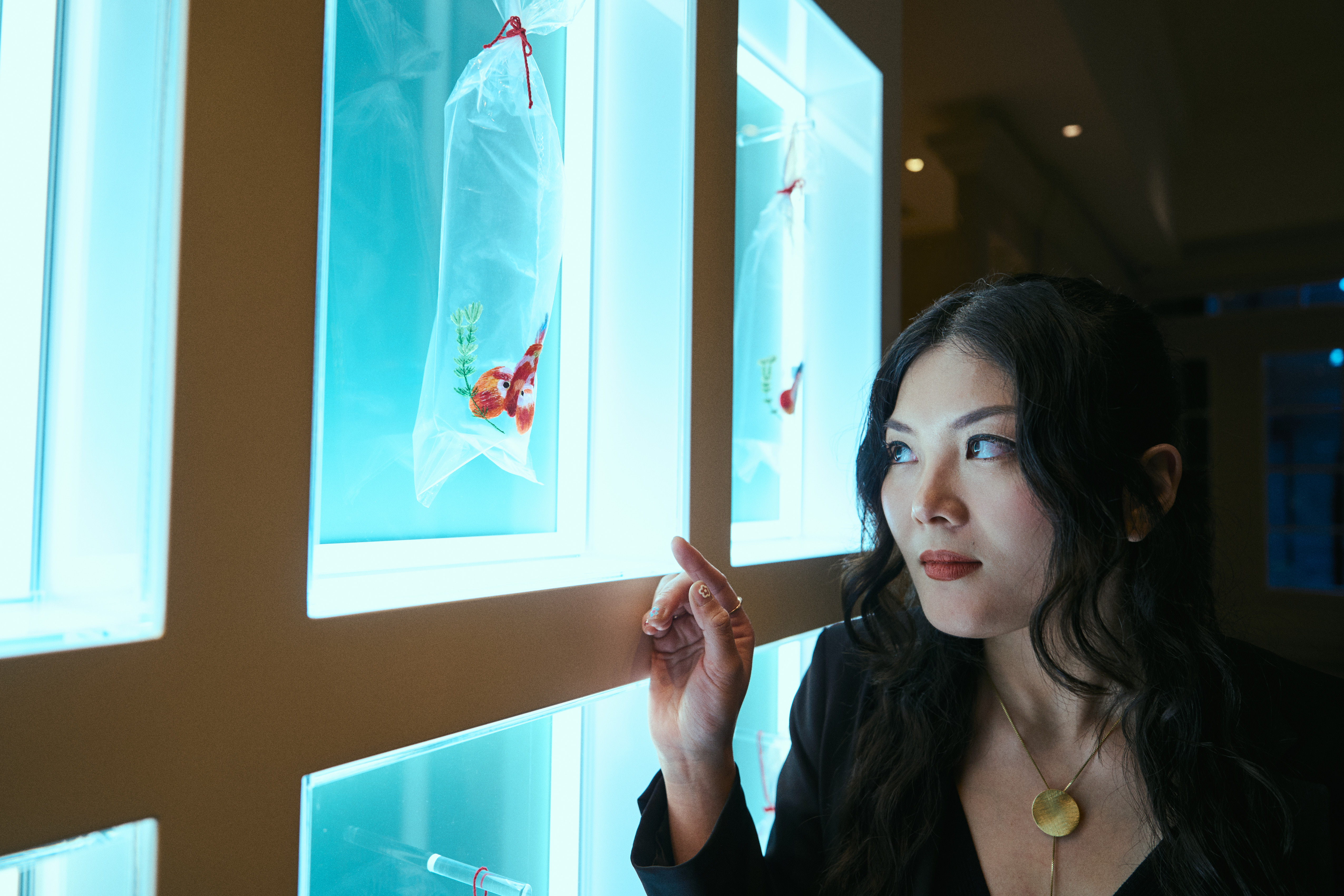 Reconocida recientemente por su selección para representar a Hong Kong en la próxima Bienal de Venecia, Hui consolida su presencia en la escena internacional. Su obra transforma objetos cotidianos en instantes de asombro silencioso, donde los peces parecen desplazarse con la luz, generando un diálogo poético entre reflejo y color tanto en el exterior como en el interior del espacio.